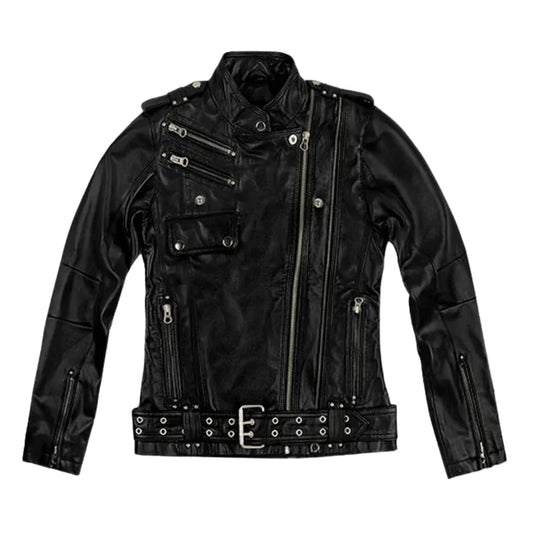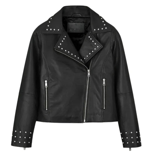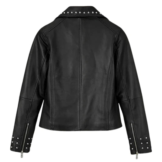 Stylish Black Leather Jacket with Studded Lapel and Cuffs The Stylish Black Leather Jacket with Studded Lapel and Cuffs is a bold outerwear piece that blends elegance with modern edge. Made from real leather, it offers a sleek texture, durability, and a premium look...- $179.00