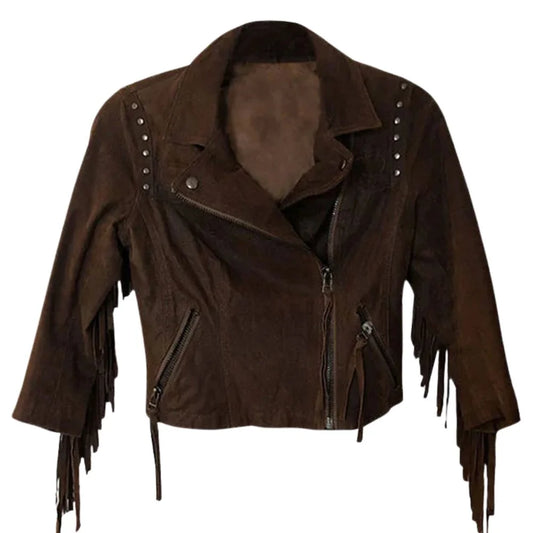 Women’s Brown Suede Leather Fringe Jacket The Women’s Brown Suede Leather Fringe Jacket is a statement piece that blends classic suede texture with bold, eye-catching details. Made from real suede leather, it offers a soft and velvety touch, ensuring both comfort and durability. The...- $179.00