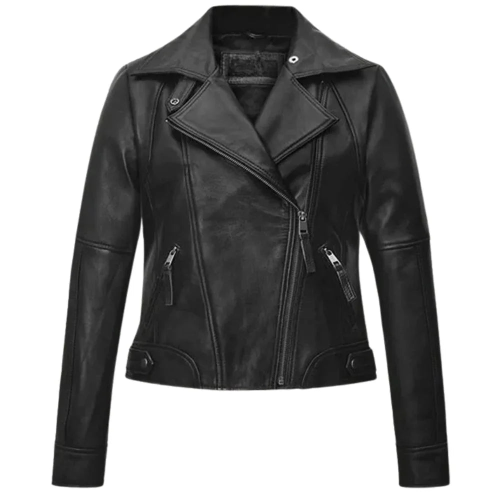 This jacket features a front zipper closure for a clean, contemporary appeal, paired with a stand-up collar that adds refinement. A soft viscose lining ensures breathable comfort, making it suitable for both casual outings and evening wear. Functional side pockets provide practicality without disrupting the streamlined design, and neatly finished cuffs complete the polished look. Whether styled with jeans for a relaxed outfit or layered over dresses for a more elevated appearance, the Classic Black Slim Fit Leather Jacket for Women is the perfect combination of elegance and functionality.