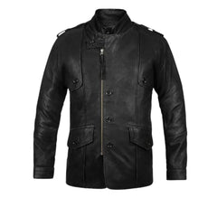 Men’s Black Button & Zip up Leather Jacket captures rugged sophistication through its structured design and timeless black finish. Expertly crafted from real leather, this jacket blends a commanding aesthetic with everyday practicality. The high-neck collar with buckle detail and shoulder epaulets add a distinctive military touch, while the tailored silhouette ensures a refined fit.