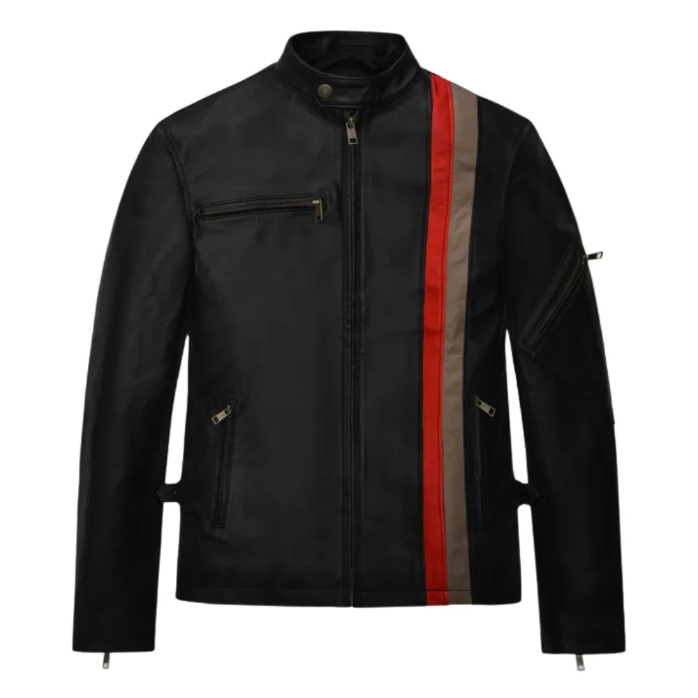 The Men’s Black Leather Jacket with Red and Tan Stripes is a bold piece designed for those who want their style to make a statement. Crafted from real leather, this jacket combines timeless craftsmanship with a sporty, contemporary edge.