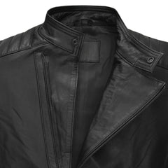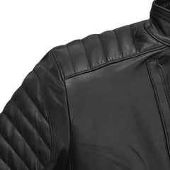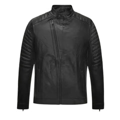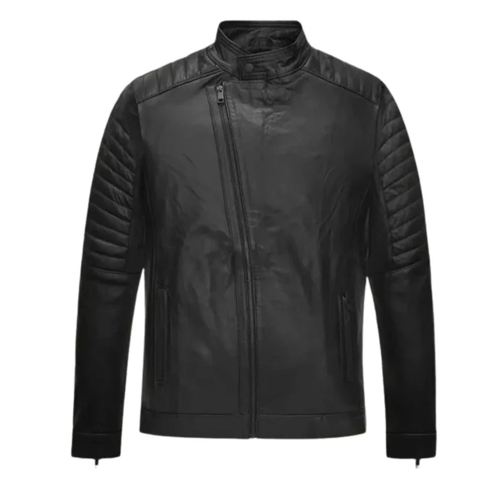 The Men’s Black Quilted Shoulder Leather Jacket with Asymmetric Zipper redefines modern sophistication with an edge of urban refinement. Crafted from real leather, this jacket combines a sleek matte-black exterior with detailed quilted shoulder and sleeve panels, creating an effortlessly stylish look. The asymmetrical front zipper adds a distinctive touch while maintaining a streamlined silhouette.