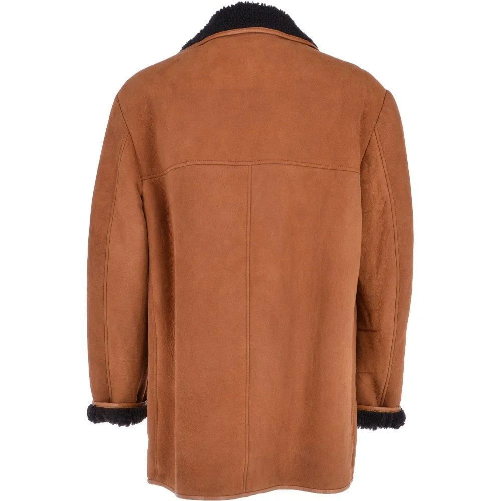 The coat features a button-front closure for a classic silhouette, complemented by a shearling-lined collar and cuffs for added insulation and texture. Two spacious front patch pockets provide practicality, perfect for keeping your essentials close at hand. The leather-trimmed edges and durable construction ensure longevity while maintaining a refined aesthetic.