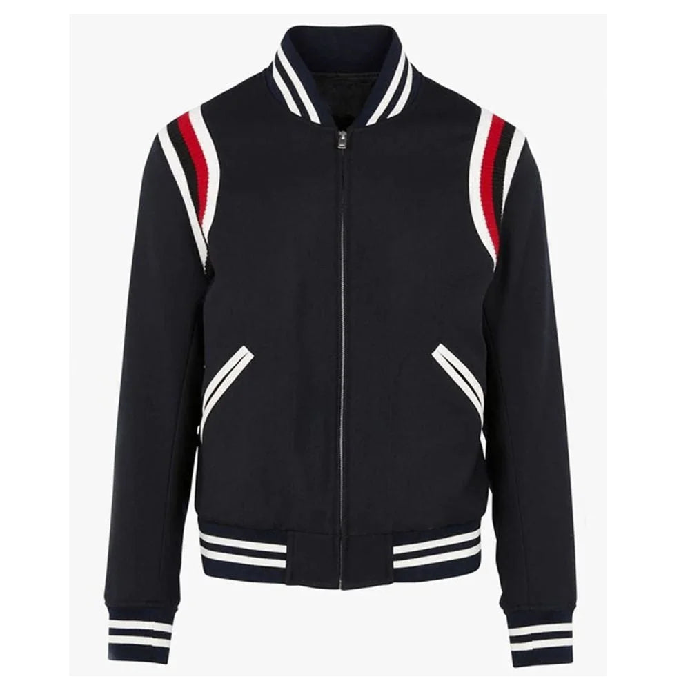 This Men's Baseball Red and White Stripes Jacket is a timeless piece that combines style and comfort. Crafted from high-quality wool, this jacket features a sleek navy design with contrasting red and white stripes on the sleeves and collar. The ribbed knit collar, cuffs, and waistband provide a cozy fit and a classic look. Perfect for layering over your favorite outfits, this jacket is both functional and fashionable.
