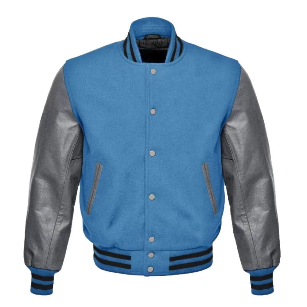 This Mens Blue and Grey Varsity Jacket jacket is a stylish and comfortable choice for any wardrobe. Crafted from high-quality wool and genuine leather, this jacket features a vibrant blue body with contrasting grey leather sleeves. The ribbed knit collar, cuffs, and waistband provide a cozy fit and a timeless look. Perfect for layering over your favorite outfits, this jacket is both functional and fashionable.