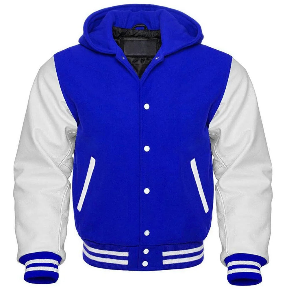 Make a bold statement with this classic Men's Blue and White Hooded Varsity Jacket. Crafted with a vibrant blue body contrasted by clean white sleeves, this Men's Blue and White Hooded Varsity jacket embodies a fresh and sporty look. The attached hood adds functionality and warmth, perfect for chilly days, while the ribbed cuffs and hem with striped detailing enhance its traditional varsity appeal. Featuring a snap-button front closure and convenient angled front pockets, this jacket combines style, practicality, and a touch of nostalgia.