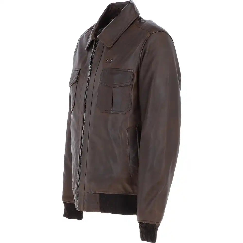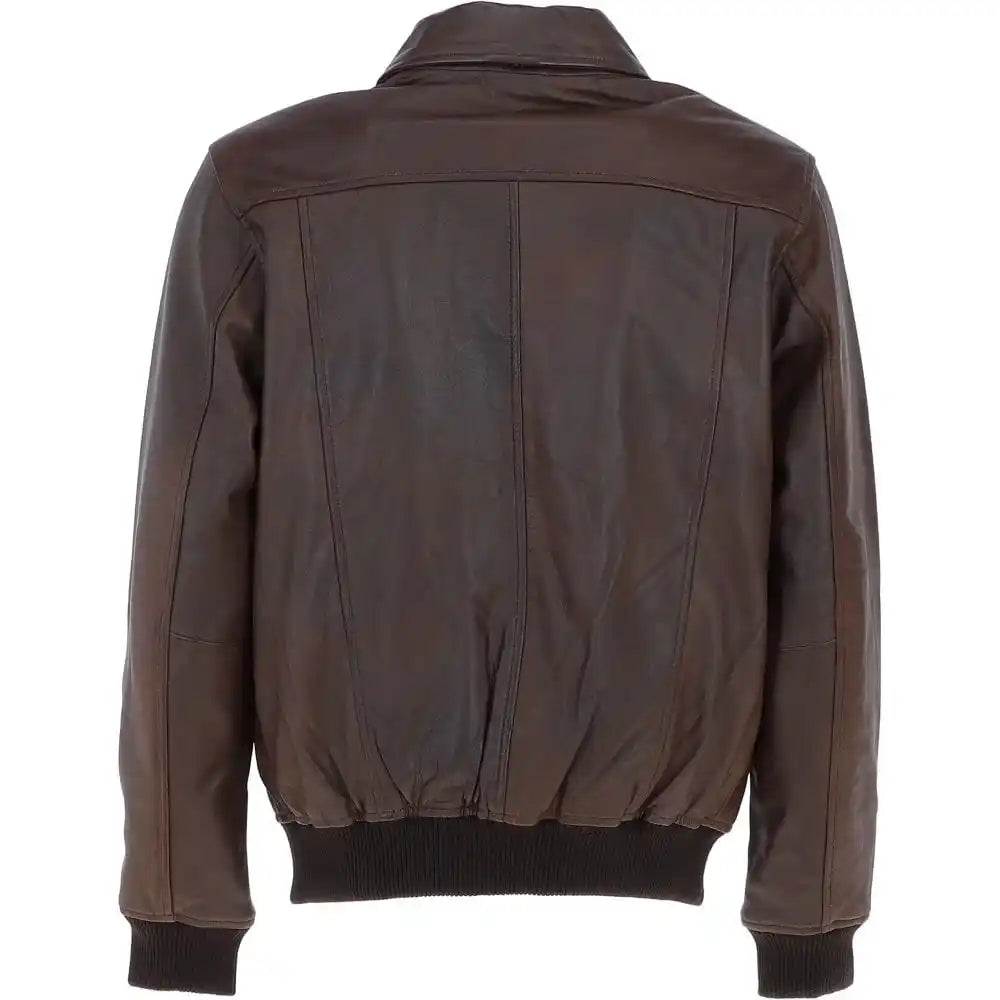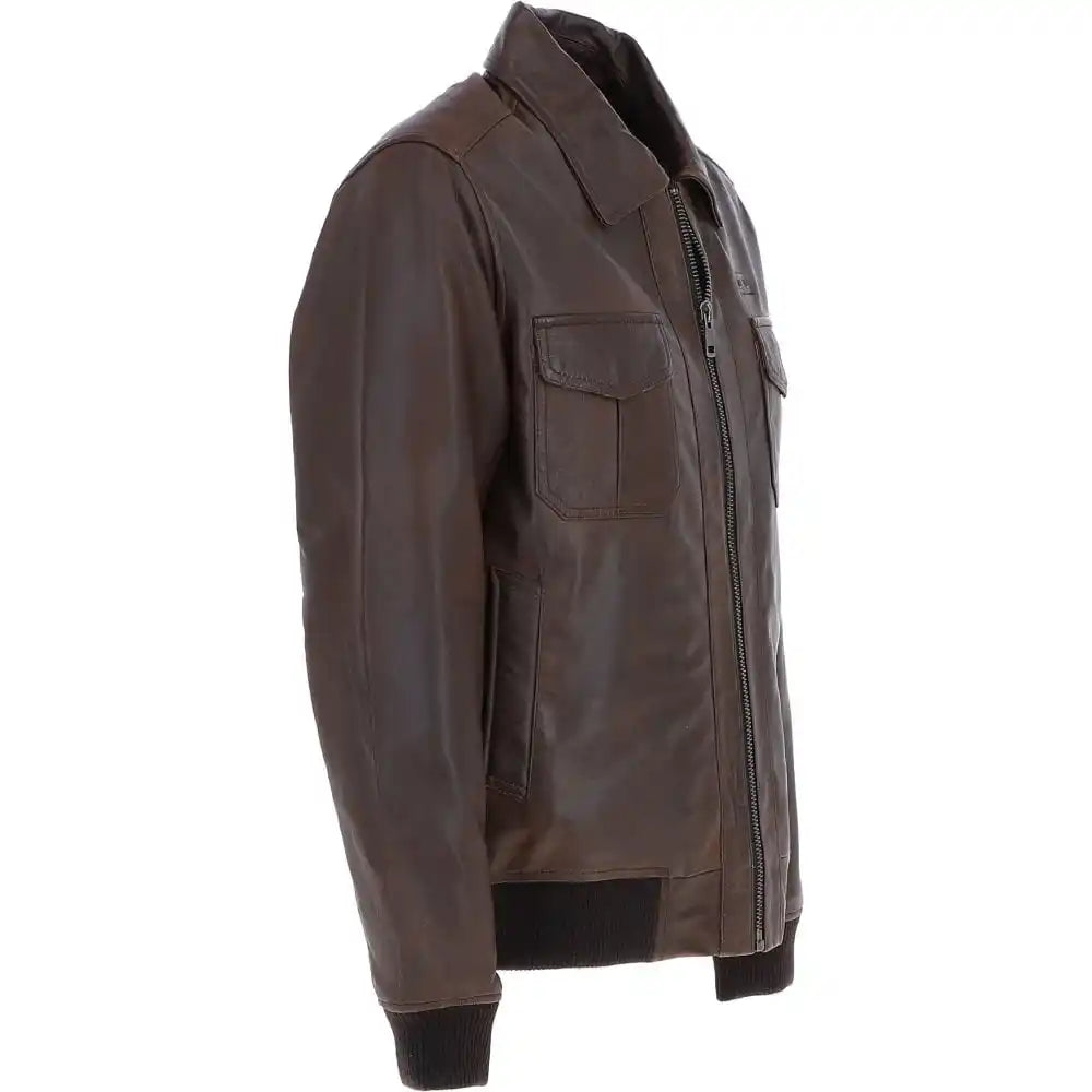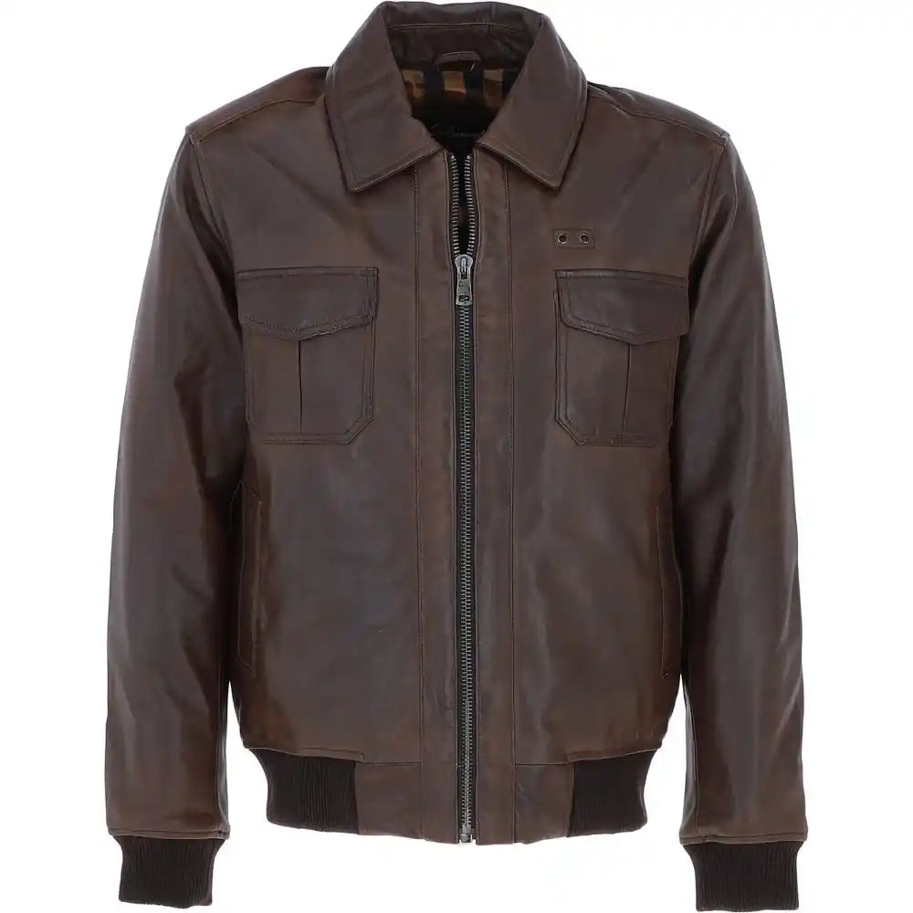 Crafted from high-quality genuine leather, this men's bomber jacket blends rugged durability with timeless style. Its deep brown tone, shirt-style collar, and ribbed hem and cuffs deliver a classic silhouette. Featuring dual flap chest pockets and side pockets for practicality, it ensures comfort with a soft inner lining. Perfect for cooler weather, it’s a versatile piece for both casual and outdoor wear.