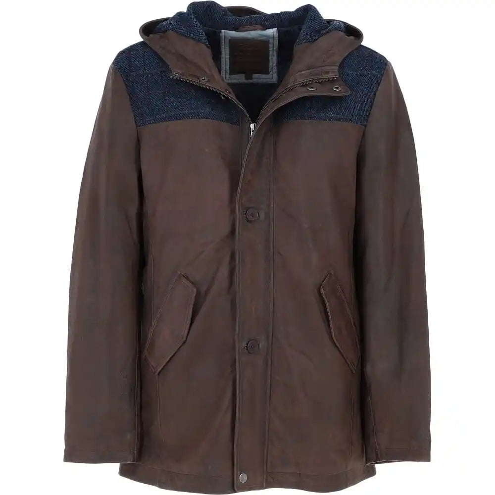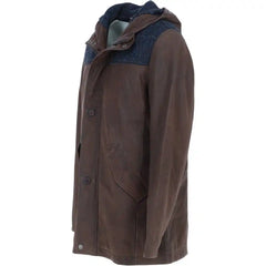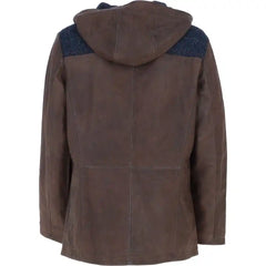 Elevate your outerwear with this Men's Brown Hooded Leather Jacket, detailed with sophisticated navy plaid accents. This premium piece is crafted from genuine leather and showcases a vintage-meets-modern design, combining function with style. The hood and shoulder panels feature rich navy plaid wool that adds both texture and visual contrast. Ideal for colder months, this jacket is equipped with a dual-button and zip closure, cozy interior lining, and two angled hand pockets for comfort. It’s a refined yet rugged option for everyday adventures or weekend getaways.