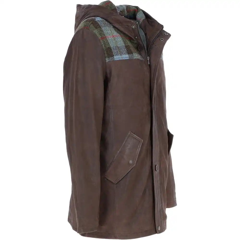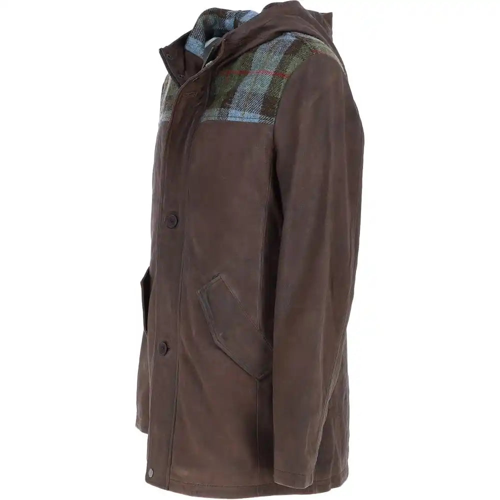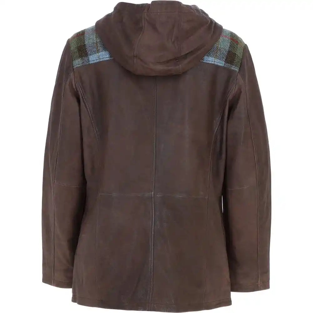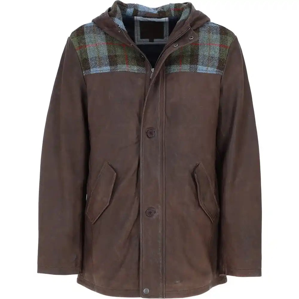 Stay warm and stylish with this Men's Brown Hooded Leather Jacket, designed for comfort and rugged charm. Crafted from genuine leather, this outerwear piece stands out with its distinctive plaid wool shoulder accents in earthy green, red, and blue tones. The functional hood, button-front closure, and deep slant pockets offer added practicality, making it ideal for chilly weather and outdoor wear. Whether you're exploring the countryside or commuting in the city, this jacket adds a touch of vintage-inspired flair to any look while delivering everyday durability.