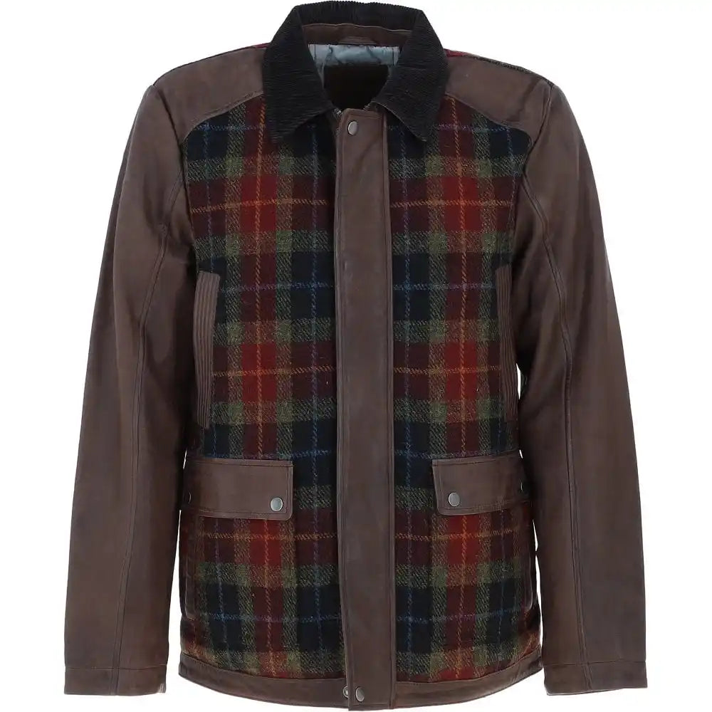 Step up your seasonal style with this unique Men's Brown Leather Jacket featuring vibrant plaid wool panels. Designed for fashion-forward individuals, this jacket blends rustic charm with a rugged edge. The supple brown leather sleeves and trim add a classic touch, while the multicolor plaid wool front injects warmth and personality. A corduroy collar and flap pockets enhance the heritage-inspired design, making it a standout piece for fall and winter layering. Whether you're in the city or countryside, this jacket keeps you warm while making a bold fashion statement.