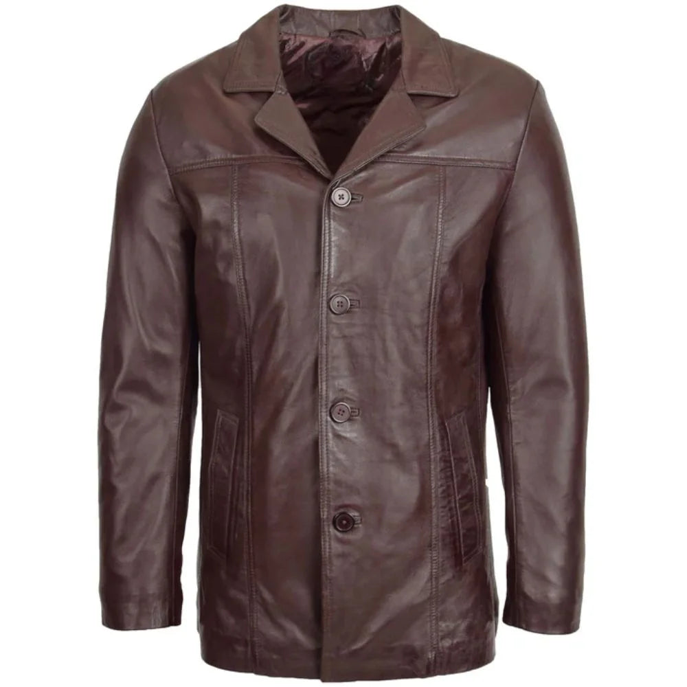 Add a refined edge to your outerwear lineup with this men's genuine brown leather reefer. Expertly crafted from 100% genuine leather, this coat features a deep brown finish that brings warmth and character to any look. The elongated cut and clean panel detailing give it a structured yet modern silhouette, perfect for layering through cooler seasons. A shirt-style collar, four-button front closure, and minimalist seam lines bring in that smart-casual versatility—ideal for both city commutes and laid-back evenings. Whether paired with trousers or denim, this reefer offers a blend of comfort, durability, and timeless style.