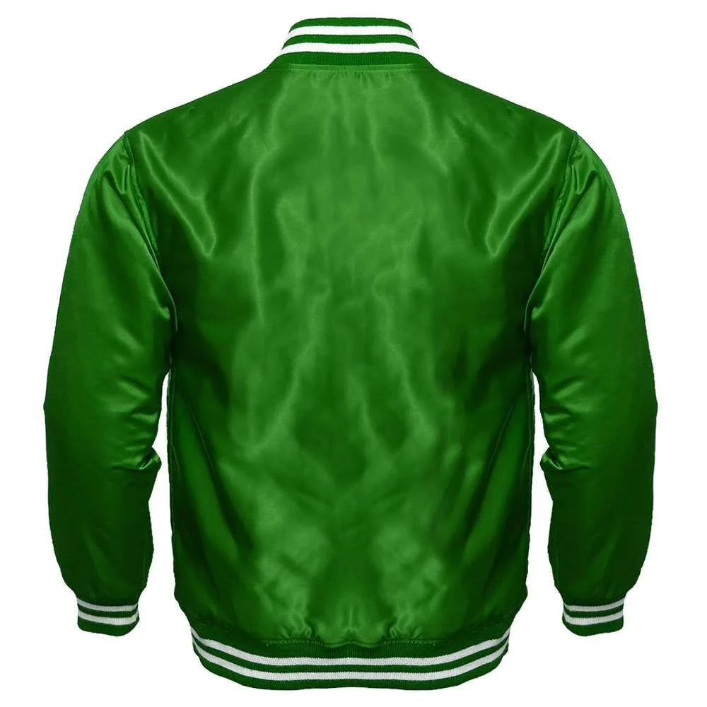 Embrace bold style with this Men's Green Satin Varsity Jacket, perfect for those who love a vibrant and unique look. Crafted from high-quality satin, this jacket showcases a striking green color complemented by white stripes on the ribbed collar, cuffs, and hem. The classic snap-button closure and two side pockets add to its timeless varsity appeal, making it ideal for both casual and statement-making outfits.