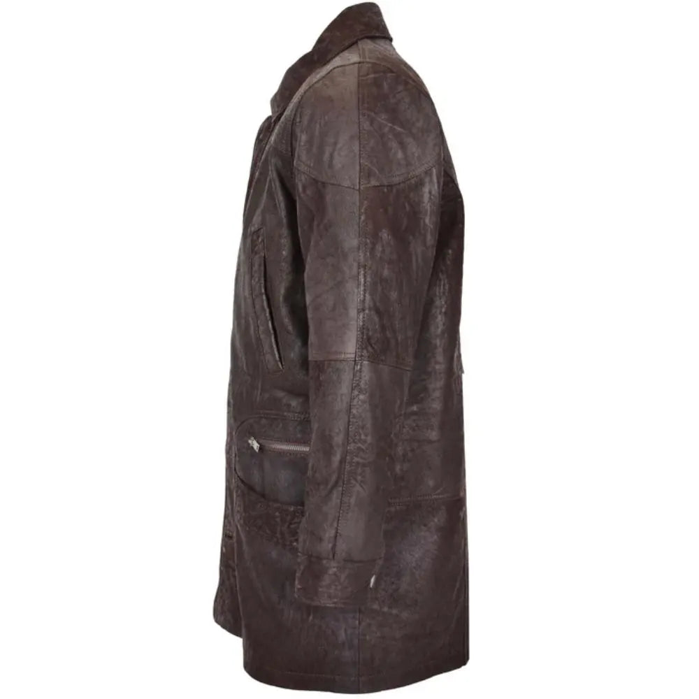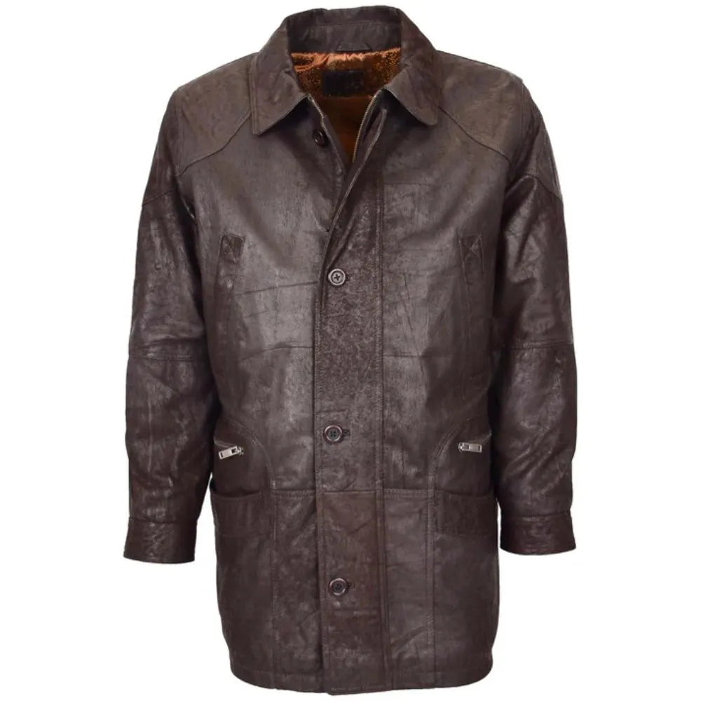 Elevate your winter wardrobe with the Men's M2 Brown Classic Leather Winter Coat, crafted from premium genuine leather with a rich vintage finish. This rugged yet refined coat features a dual front closure—zipper and button—for maximum insulation and timeless style. A classic collar and multiple pockets, including two flap and two zippered chest pockets, offer both function and form. Designed for a regular fit, it’s lined with premium fabric for all-day comfort in cooler weather. Whether you're exploring the outdoors or heading to a casual gathering, this winter coat delivers warmth, durability, and effortless style.