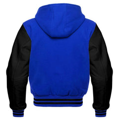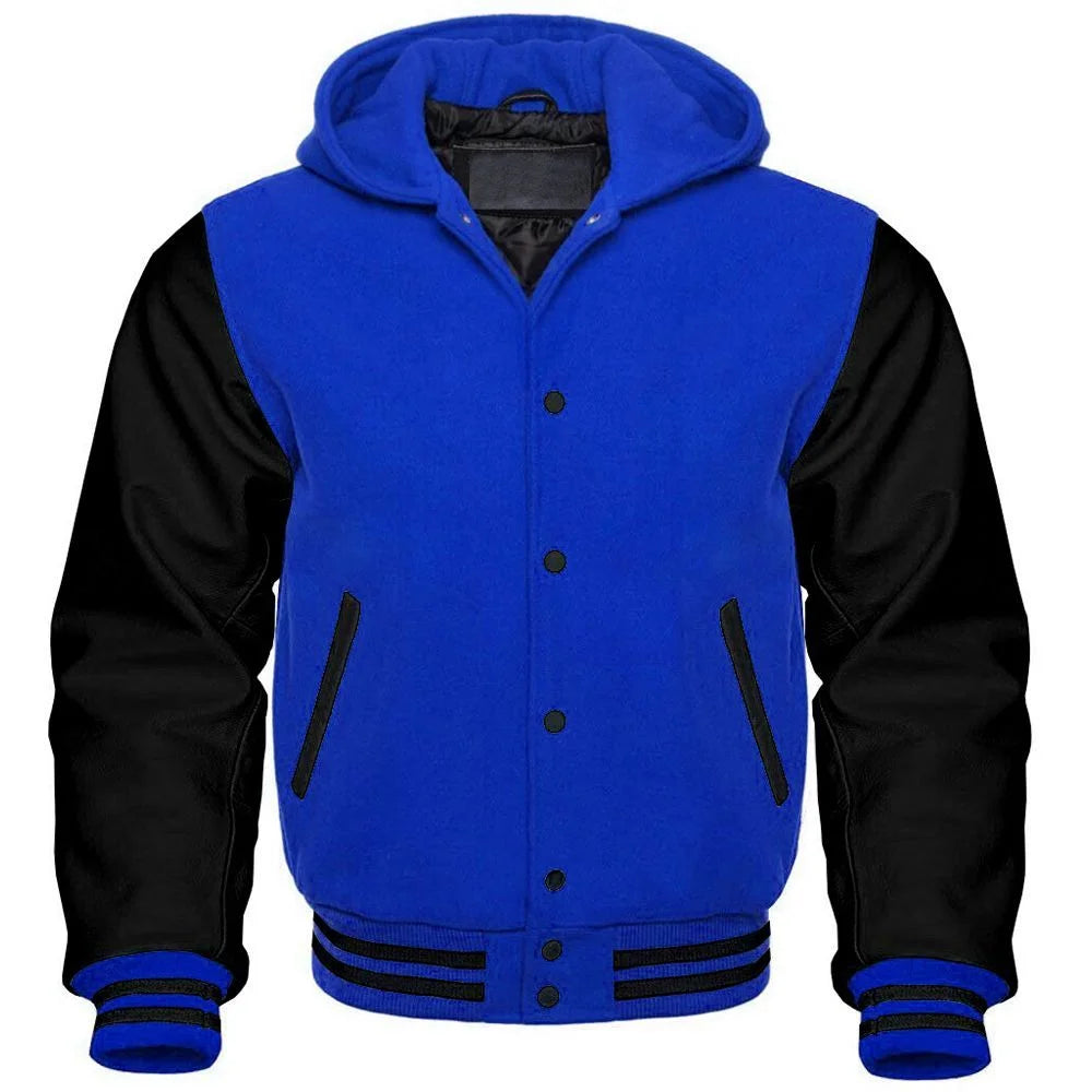 Add a pop of color to your wardrobe with the Men's Royal Blue and Black Hooded Varsity Jacket. This eye-catching piece features a bold royal blue body paired with sleek black sleeves, creating a stylish contrast that’s perfect for casual wear. The jacket is designed with a cozy hood, snap-button closure, ribbed cuffs, and a hem that locks in warmth. With two front pockets for convenience, this varsity jacket combines functionality with a trendy look.