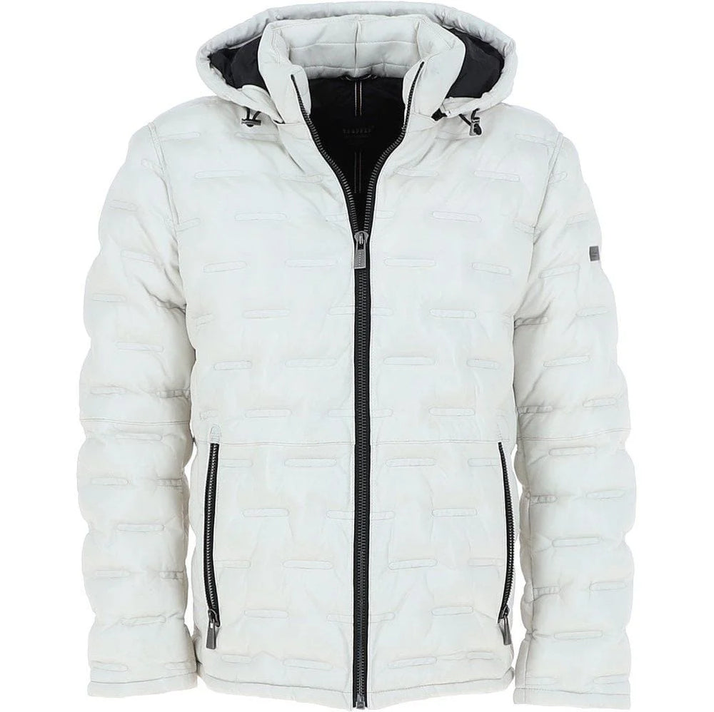 Make a bold style statement with this men's white quilted leather hooded jacket, designed for both warmth and contemporary appeal. Crafted from high-quality genuine leather, this jacket features a distinctive quilted pattern that enhances insulation while maintaining a sleek aesthetic. The detachable hood adds versatility, allowing you to adjust your look for different occasions. A full-zip front closure ensures a secure fit, while two zippered side pockets offer convenient storage. Whether you're navigating winter streets or layering up for an urban-chic outfit, this quilted leather jacket is the perfect combination of luxury, function, and modern style.