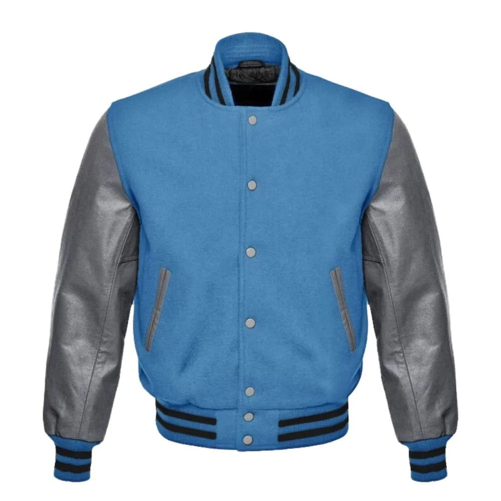 This Sporty Men’s Varsity Leather Jackets is a stylish and comfortable choice for any wardrobe. Crafted from high-quality wool and genuine leather, this jacket features a classic blue body with contrasting grey leather sleeves. The ribbed knit collar, cuffs, and waistband provide a cozy fit and a timeless look. Perfect for layering over your favorite outfits, this jacket is both functional and fashionable.