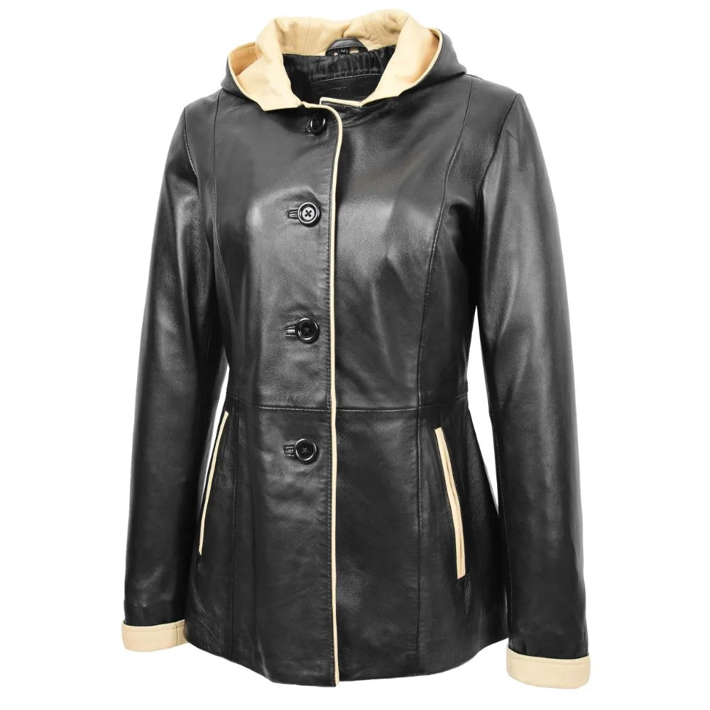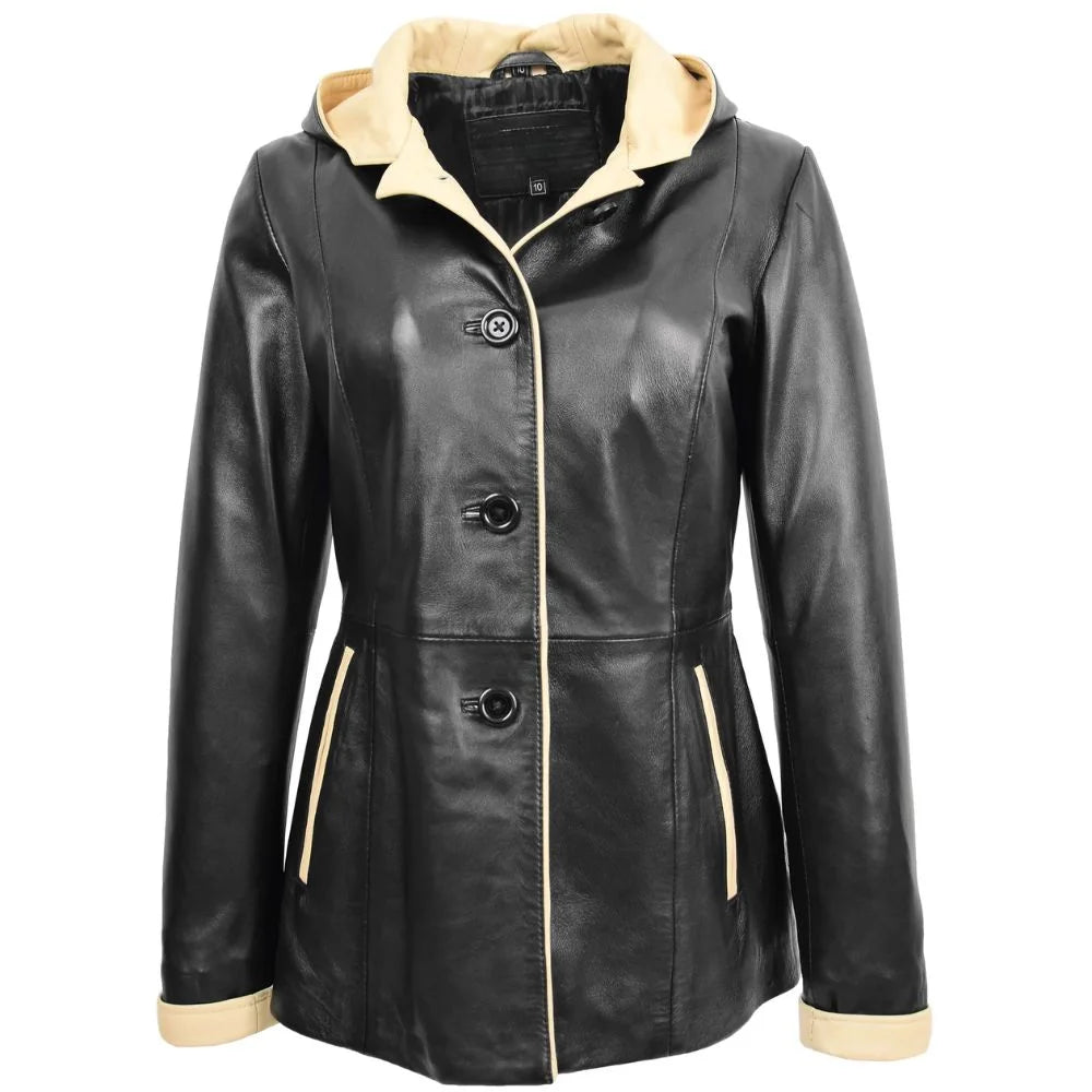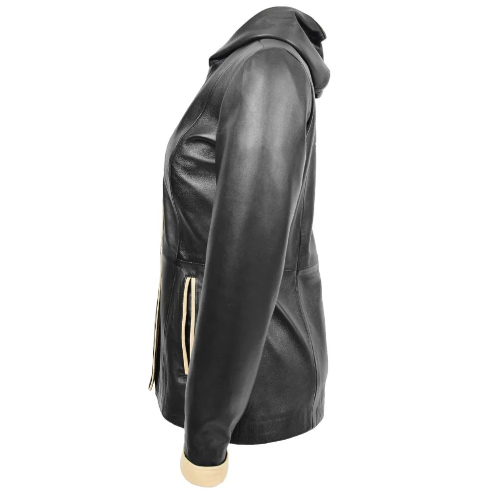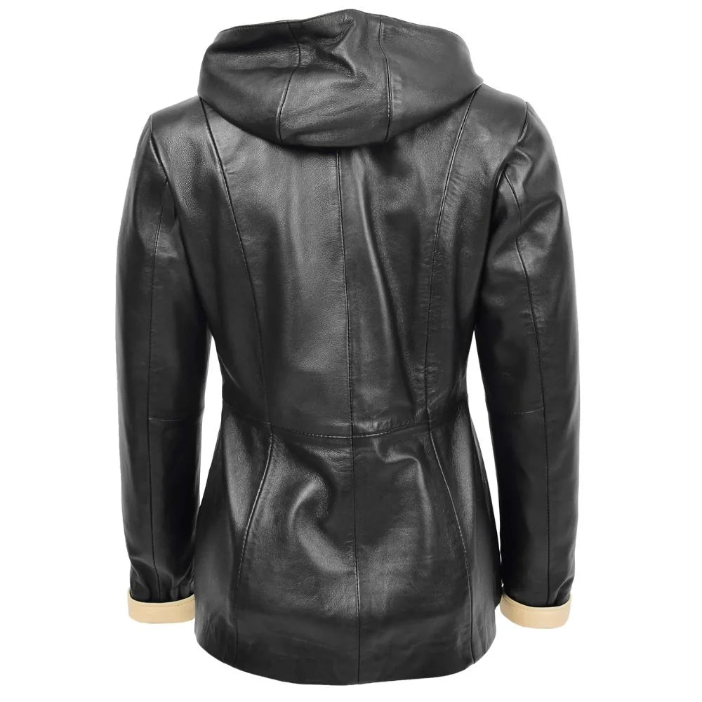 Add an unexpected twist to classic sophistication with this Women’s Black Leather Blazer Jacket featuring a sleek hood detail. Made from premium real leather, it delivers timeless blazer tailoring while introducing a modern, casual edge with its integrated hood. The smooth leather finish and contoured stitching at the back enhance the silhouette, making it both elegant and figure-flattering.