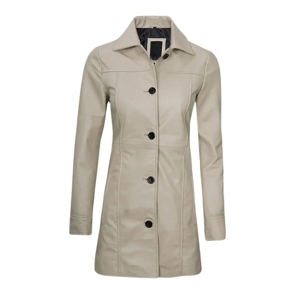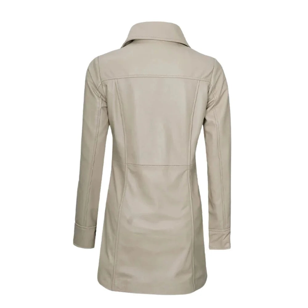 This sophisticated beige leather coat is a must-have for any woman who appreciates classic style with a contemporary twist. The soft, neutral hue exudes timeless elegance, while the clean lines and minimalist design create a versatile piece that can be dressed up or down. Crafted from premium leather, this coat offers durability and a luxurious feel that will only improve with time. Whether you're heading to work, exploring the city, or enjoying a weekend getaway, this leather coat will keep you looking stylish and feeling confident. The button-down front and collar add a touch of sophistication, while the tailored fit accentuates your figure. The coat's lightweight design makes it perfect for layering, ensuring you stay comfortable throughout the seasons.
