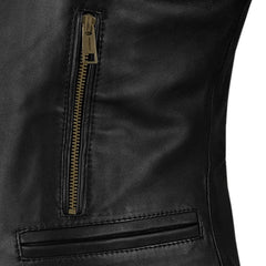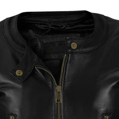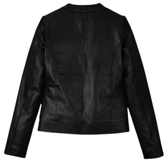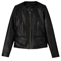 Bring sophistication to your wardrobe with the Women’s Black Leather Jacket with Round Collar. This elegant piece offers a sleek, contemporary silhouette enhanced by its unique round neckline, giving it a modern twist compared to traditional lapel styles. Designed with multiple front zipper pockets, it effortlessly combines practicality with chic appeal. The jacket’s structured fit ensures a flattering shape, making it versatile enough to pair with casual jeans, workwear, or evening outfits. Perfect for transitional seasons, this jacket delivers both comfort and timeless style.