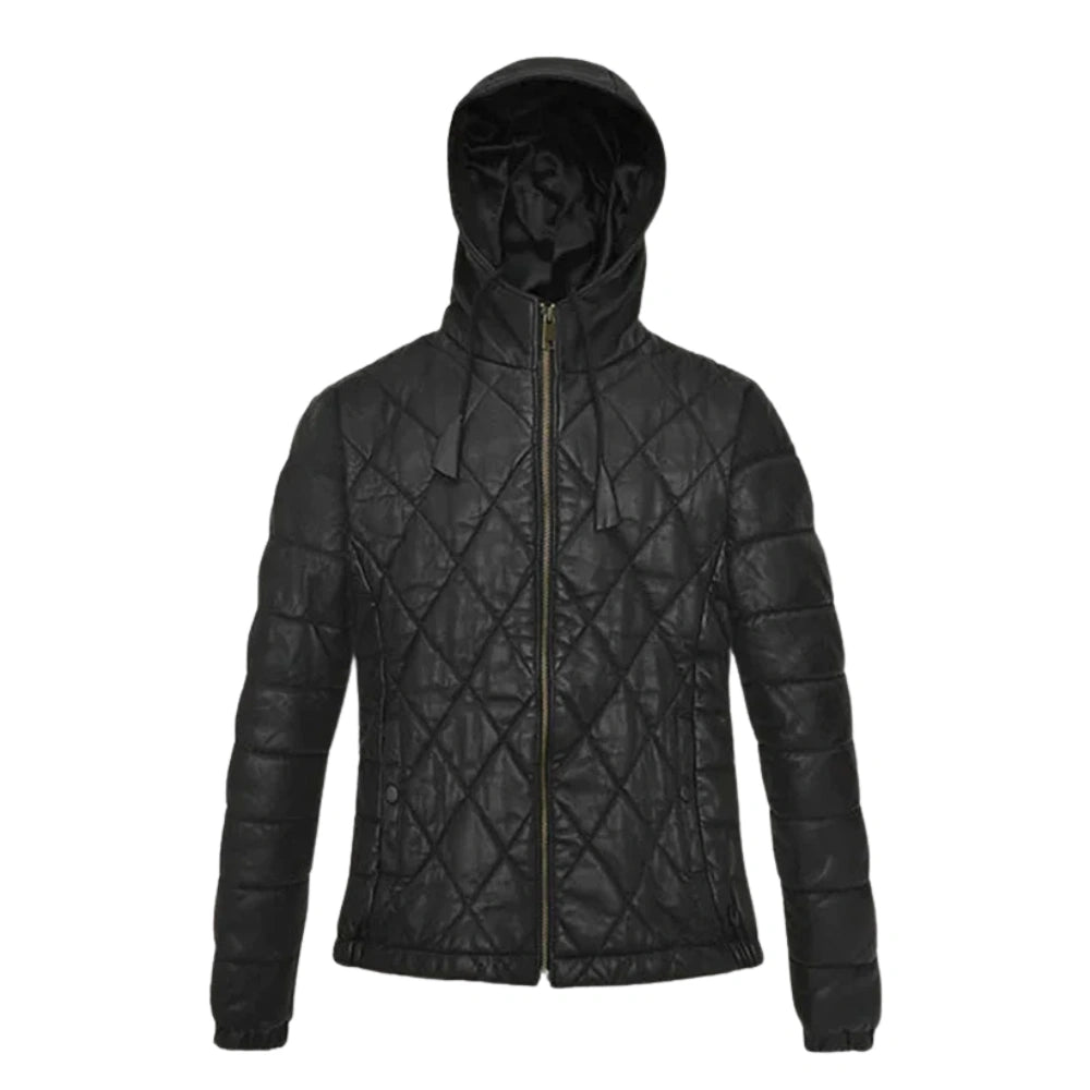 This jacket comes with a front zipper closure for ease of wear and a detachable hood with drawstrings, offering extra protection against wind and light rain. A soft viscose lining inside ensures breathable comfort, while two side pockets add functionality without compromising its stylish design. The diamond-quilted stitching not only boosts insulation but also brings a chic, contemporary appeal. Whether paired with casual jeans or layered over a dress, the Women’s Black Quilted Leather Jacket with Hood delivers effortless urban style.