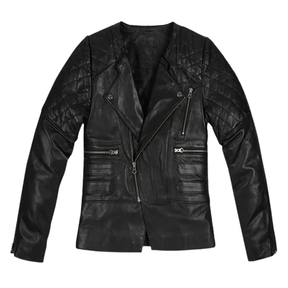 The Women’s Black Quilted Shoulder Leather Jacket is the perfect balance of modern edge and timeless elegance. Designed with quilted detailing on the shoulders and upper sleeves, it brings a chic touch to a classic silhouette. Crafted from real leather, this jacket features a flattering slim fit with an asymmetrical zipper front for a stylish twist.
