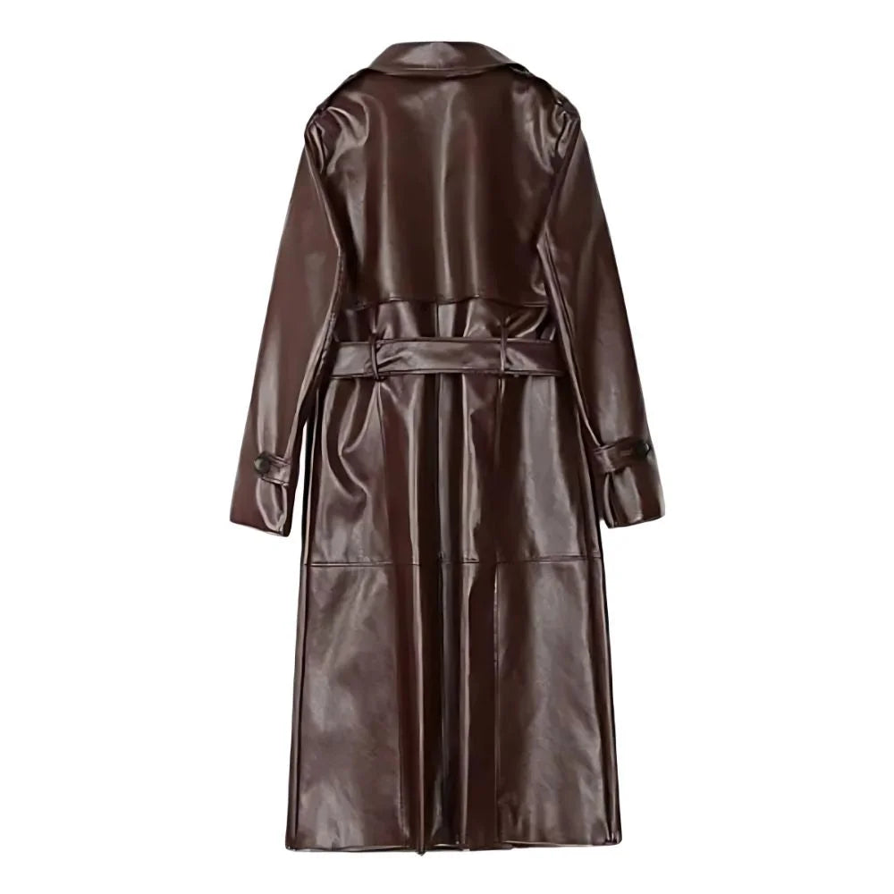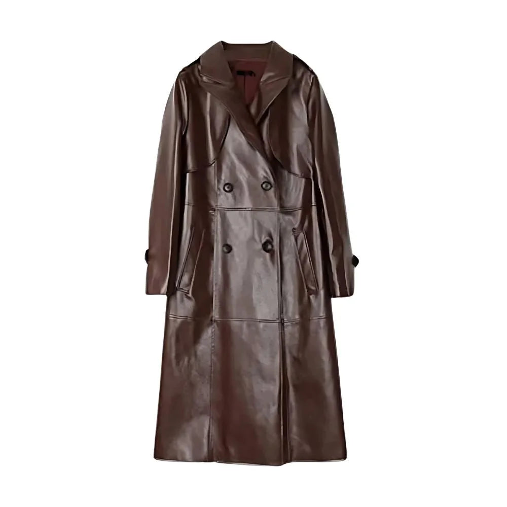 Make a fashion statement with this brown leather trench coat for women that exudes timeless elegance. The style, combined with a streamlined belt, adds sophistication to your silhouette. This warm and durable coat will help you through any situation: formal meetings or casual strolls around the city. Its long length and deep brown color make it a wardrobe classic that can be worn with many different outfits.