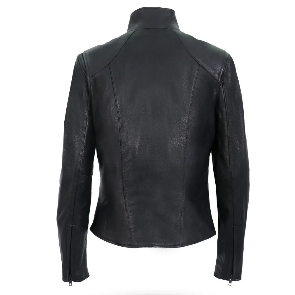 Designed with versatility in mind, this black leather jacket offers a combination of comfort and durability. The lightweight but resilient leather ensures breathability while maintaining a sharp appearance, making it ideal for all seasons. Featuring a convenient zipper closure and zippered pockets, this jacket provides practicality without sacrificing style. Whether paired with jeans or a dress, this jacket is sure to become a go-to piece in your wardrobe.