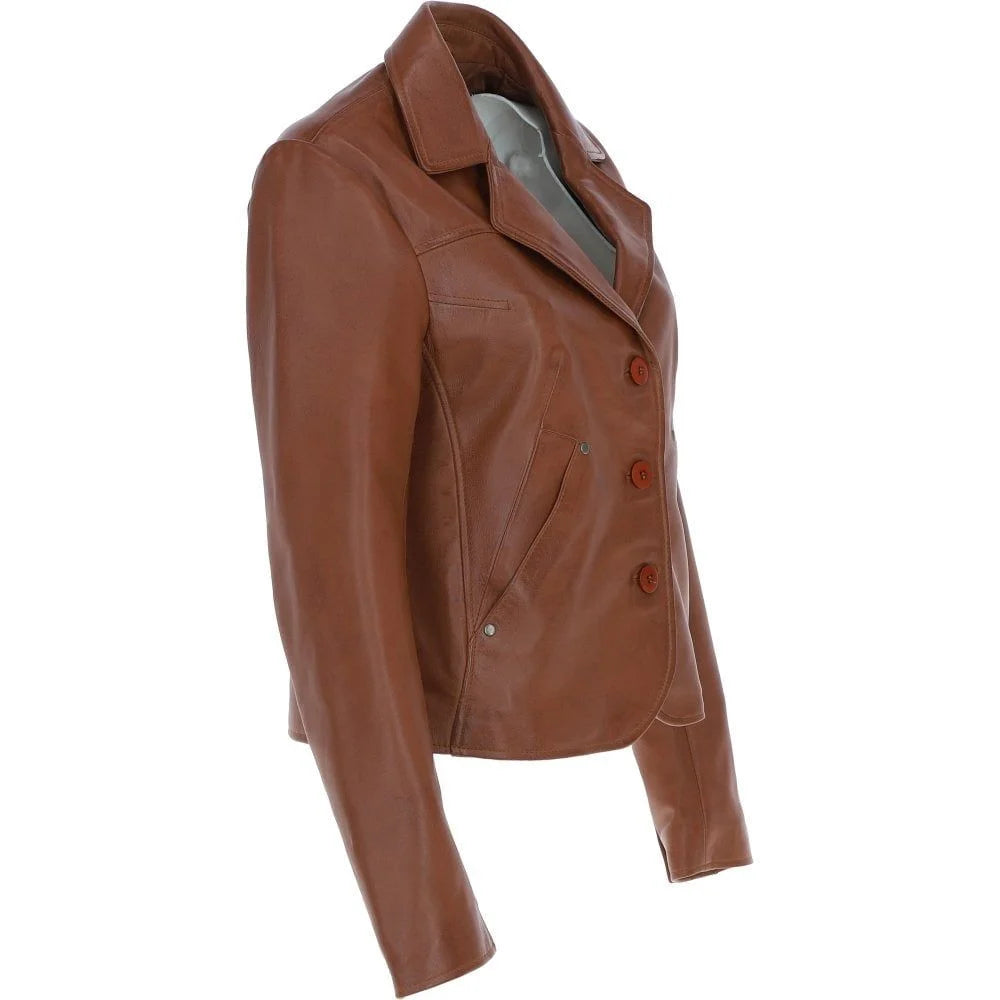 Step up your style game with this Women's Brown Leather Blazer Jacket, a timeless piece that combines sophistication and versatility. Crafted from high-quality leather, this blazer features a warm brown tone that exudes understated elegance. The tailored fit and classic lapel collar create a polished look, perfect for professional settings and casual outings alike.