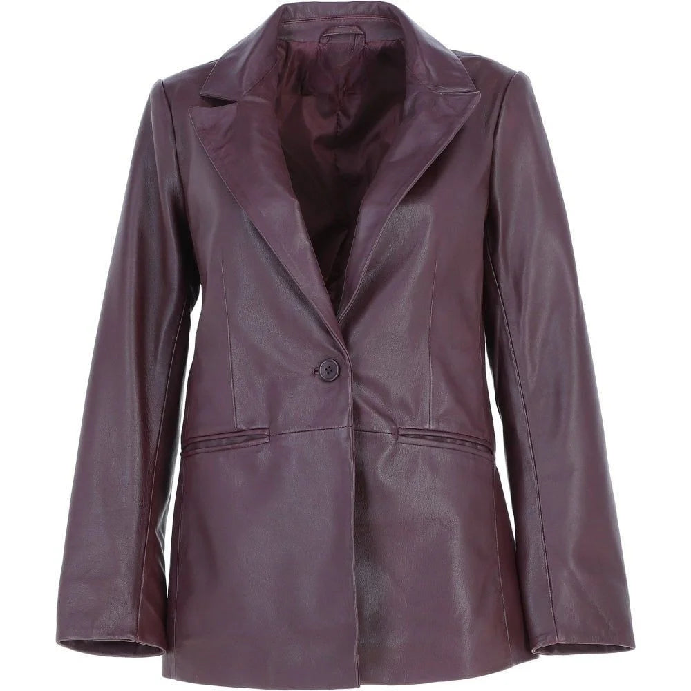Make a bold fashion statement with this women's burgundy leather blazer, a luxurious blend of sophistication and modern style. Crafted from premium genuine leather, this blazer features a sleek and structured fit that enhances your silhouette while ensuring comfort and durability. The notched lapel collar and single-button front closure offer a timeless and elegant look, making it perfect for business meetings, evening events, or chic casual wear. Designed with clean-cut seams and discreet side pockets, this blazer is the epitome of effortless style. Whether paired with tailored pants or layered over a dress, this leather blazer adds a refined touch to any outfit.