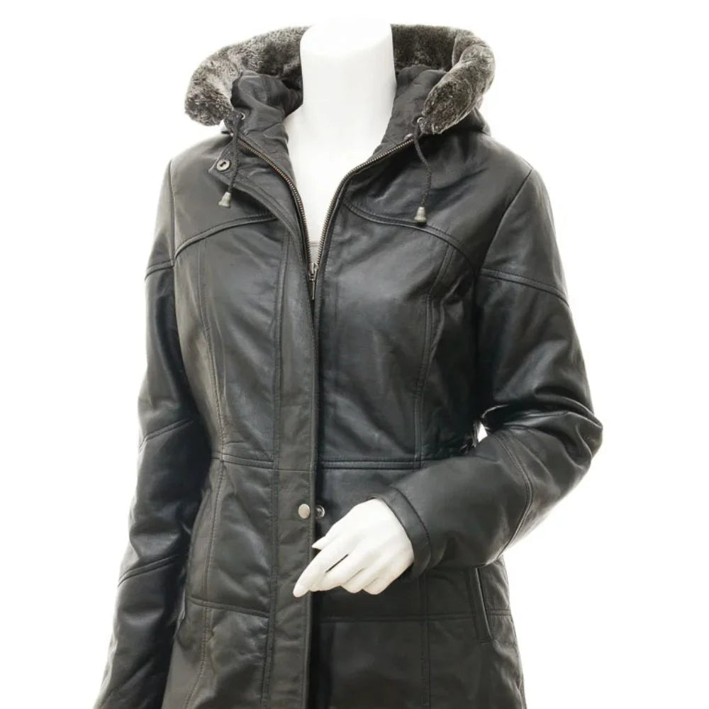 Stay warm and stylish this season with the Women’s Black Hooded Leather Coat, designed for both elegance and everyday practicality. Crafted from genuine real leather, this coat offers a sleek black finish with a flattering feminine silhouette. The standout feature is its hood lined with plush faux fur trim, adding both warmth and a touch of luxury to your winter wardrobe.